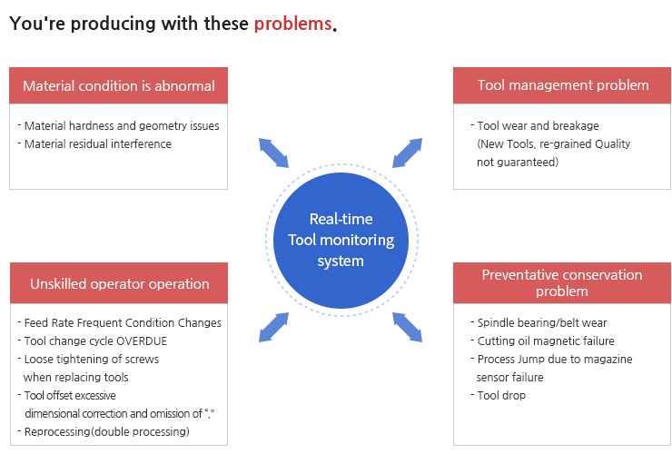 - In case of abnormal operation, alarm is triggered to induce permanent use of the tool monitoring system (Force function!!))